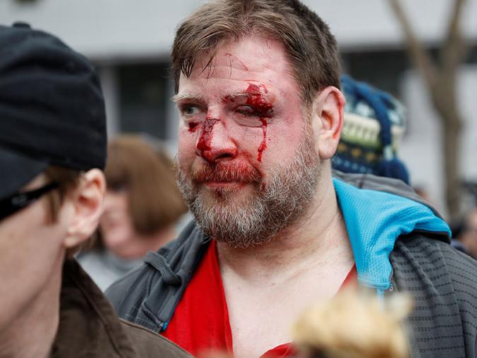 Dopo un raduno dal nome “People 4 Trump” (Persone a favore di Trump), è stato visto un sostenitore del presidente Donald Trump insanguinato, dopo che le proteste sono diventate violente a Berkeley, California 4 mar 2017. Credit: REUTERS/Stephen Lam.