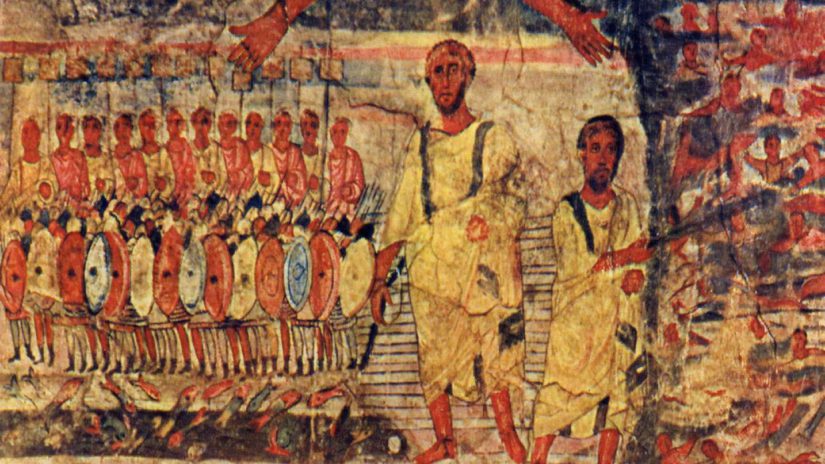 Ebrei attraversano il Mar Rosso inseguiti dal Faraone. Affresco della sinagoga di Dura Europos Credit: Wikimedia Commons