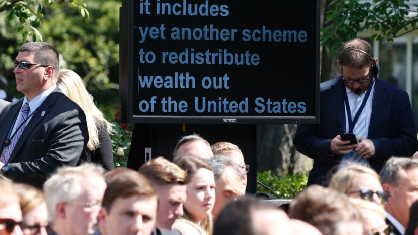 Il gobbo del presidente degli Stati Uniti Donald Trump, fotografato mentre il presidente annuncia che gli Stati Uniti si ritireranno dall’accordo sul Clima di Parigi. Credit: REUTERS/Joshua Roberts