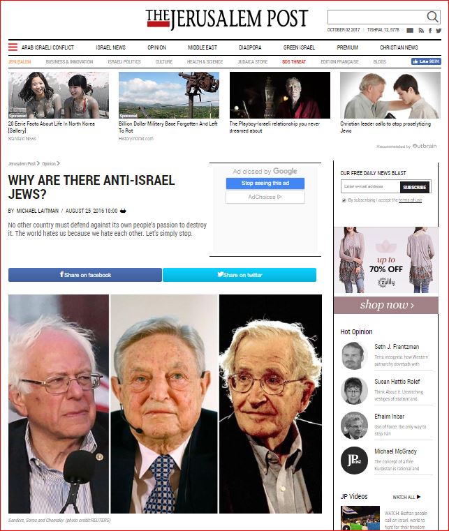 In the current zeitgeist, a great many Jewish people living in the Diaspora are either overtly or covertly anti-Israel. Sidney and Max Blumenthal, Noam Chomsky, and even Bernie Sanders, of whom I wrote in a previous column, are prominent examples of Jews engaged in anti-Israel activities. But perhaps the archetype of Israel-hating is billionaire, George Soros. Mr. Soros spends millions of his own money each year to support anti-Israel organizations and pressures the American government to support the supposed “victims” of Israel.