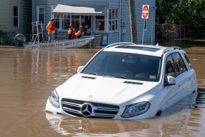 Members of the Oakland Fire Department rescue residents trapped by flooding following torrential rains from the remannts of Hurricane Ida in Lodi, New Jersey, September 2, 2021. (Photo by Michael Candelori/NurPhoto)