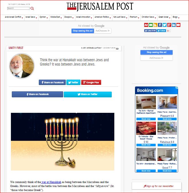 Thus, the war at Hanukkah wasn’t over land. It was over the sustenance of the authentic Jewish approach to the Torah, i.e. upholding its principle tenet of uniting in brotherly love, “love your friend as yourself.”