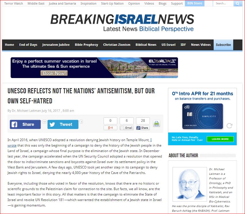 In April 2016, when UNESCO adopted a resolution denying Jewish history on Temple Mount, I wrote that this was only the beginning of a campaign to deny the history of the Jewish people in the Land of Israel, a campaign whose final purpose is the elimination of the Jewish state. In December last year, the campaign accelerated when the UN Security Council adopted a resolution that opened the door to indiscriminate sanctions and boycotts against Israel over its settlement policy in the West Bank and Jerusalem. A few days ago, UNESCO took yet another step in its campaign to deny Jewish rights to Israel, denying the nearly 4,000-year history of the Cave of the Patriarchs.