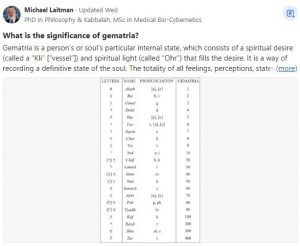 In other words, when we attain the soul, we perceive through a new sense called a “screen” (“Masach”), an intention that equalizes between the Creator’s light (“Ohr”) and the desire (“Kli”) of the created being. Gematria thus becomes an expression in our world of what we perceive with the screen.