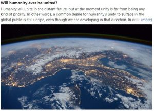 Humanity will unite in the distant future, but at the moment unity is far from being any kind of priority. In other words, a common desire for humanity’s unity to surface in the global public is still unripe, even though we are developing in that direction.