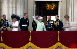 Britain’s Queen Elizabeth II (4th-R) waves to the crowd as members of the royal family (L-R) Prince Charles; Camilla, Duchess of Cornwall; Prince Harry; The Duke of York; The Duke of Edinburgh; The Earl of Wessex; and The Countess of Wessex look on at Buckingham Palace as part of the celebrations of the 60th anniversary of VE Day in London, July 10, 2005. Thousands of British war veterans gathered in central London on Sunday to mark the 60th anniversary of the end of World War Two, a ceremony made all the more poignant by last week’s deadly bombings in the capital. REUTERS/Paul Hackett RD/SA