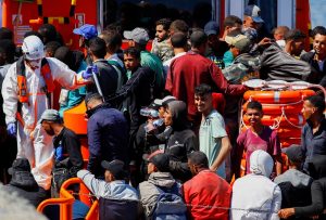 Migrants wait to disembark from a Spanish coast guard vessel, in the port of Arguineguin, in the island of Gran Canaria, Spain, September 15, 2021. REUTERS/Borja Suarez