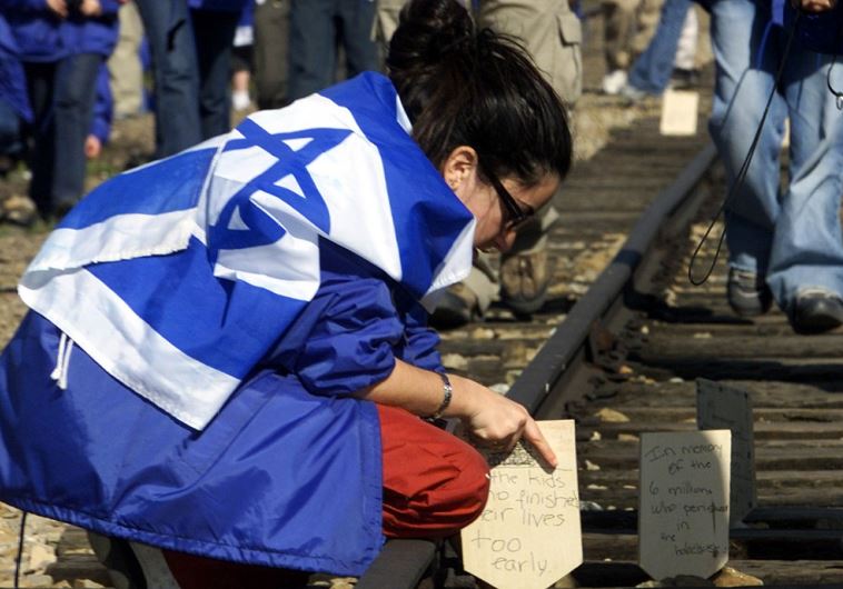 Uma menina judia coloca uma placa de madeira sobre a via férrea para marcar a morte de seus familiares no campo de concentração nazi em Auschwitz-Birkenau. (foto:REUTERS)
